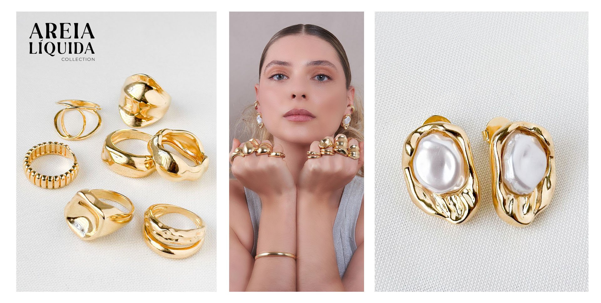 Areia Líquida é uma coleção que traz formas fluidas, quase esculturais, inspiradas pelo movimento do mar. Suas formas lembram o movimento ondular das águas e o estado de transformação do ouro, derretendo e escorrendo suavemente, construindo imperfeições. Essa estética remete ao conceito de joias como extensão da natureza, que são peças que valorizam texturas irregulares, e fazem parte da moda contemporânea.