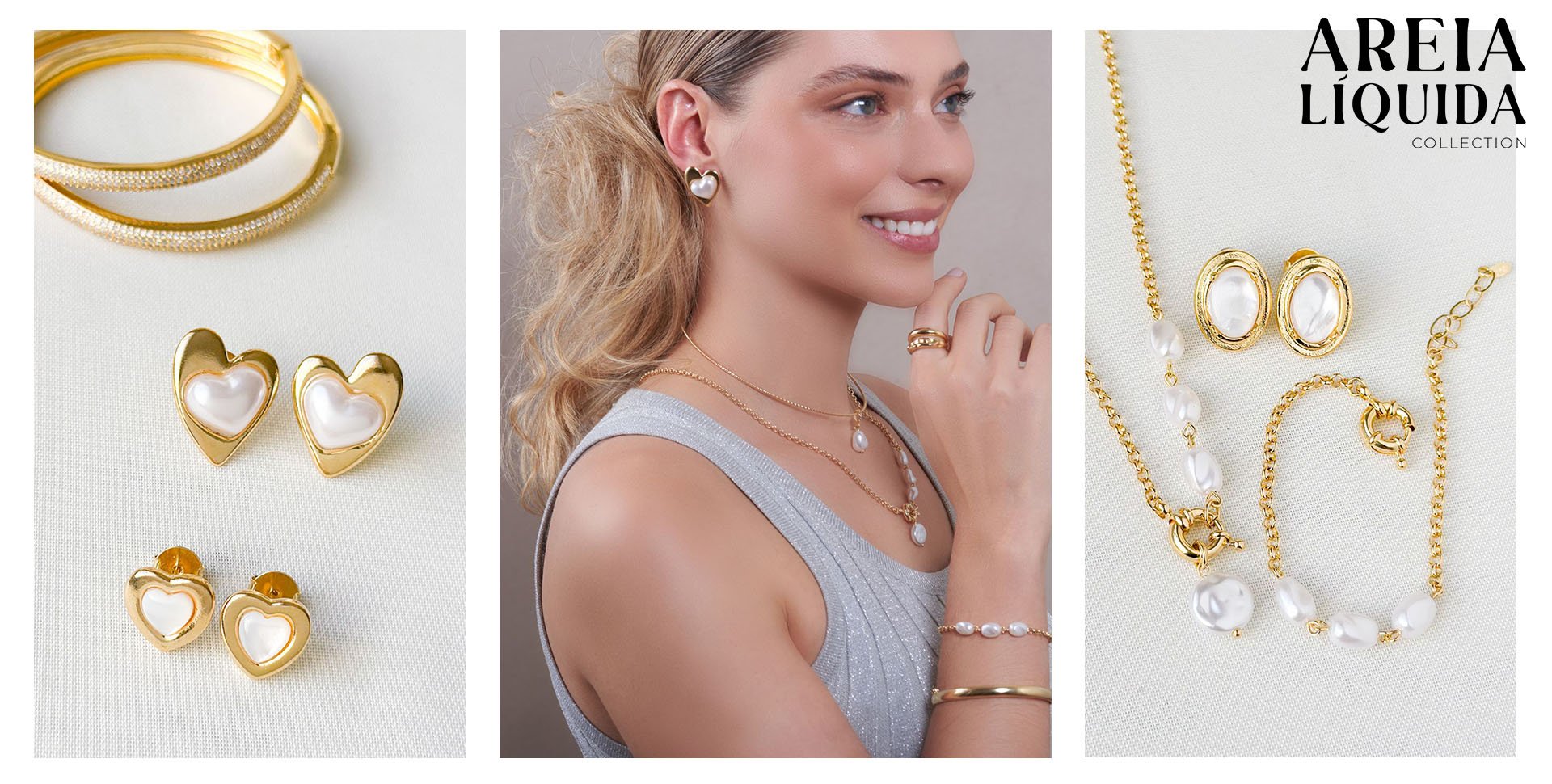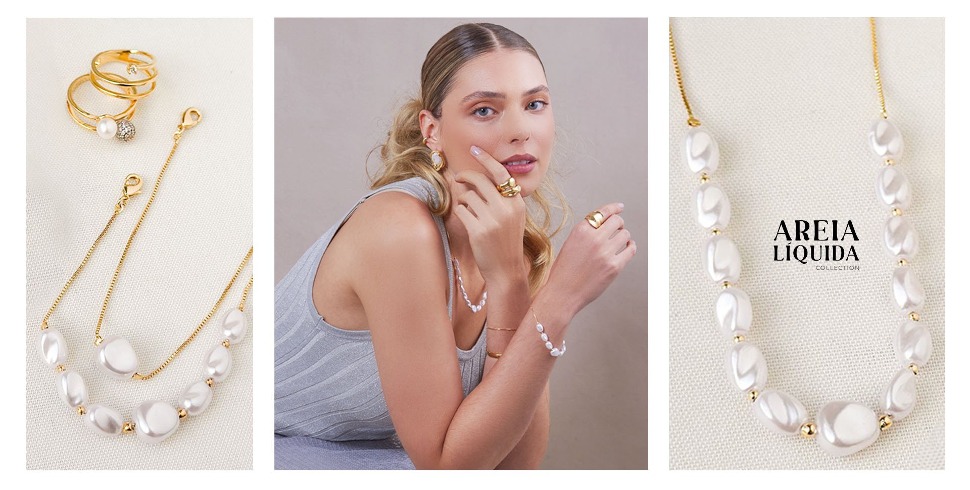 Descubra a Coleção Areia Líquida: joias esculturais com pérolas barrocas e formas fluidas, inspiradas no mar e na moda contemporânea.