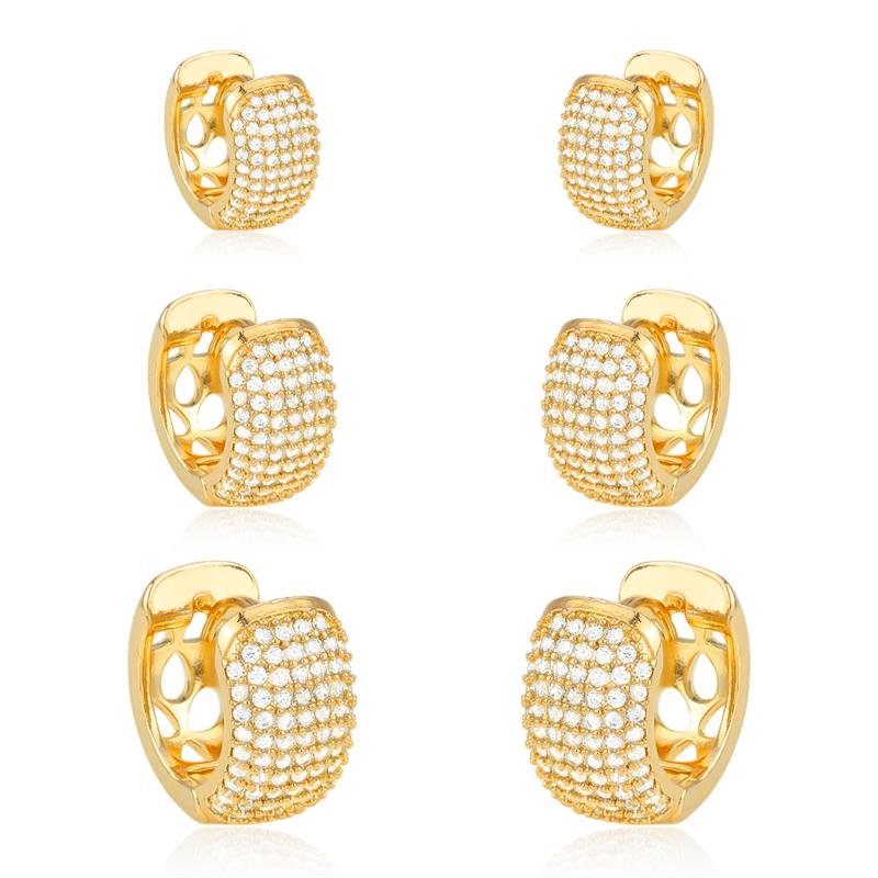 As Argolas Trio Folheadas com Zircônias são peças deslumbrantes e sofisticadas, ideais para quem busca elegância e brilho. Cravejadas com zircônias, essas argolas oferecem um toque de luxo, enquanto o acabamento folheado em ouro 18k garante durabilidade e resistência. Perfeitas para complementar qualquer look, são uma excelente opção para revenda no atacado de semijoias finas e tendências da moda.Dimensões aproximadas: