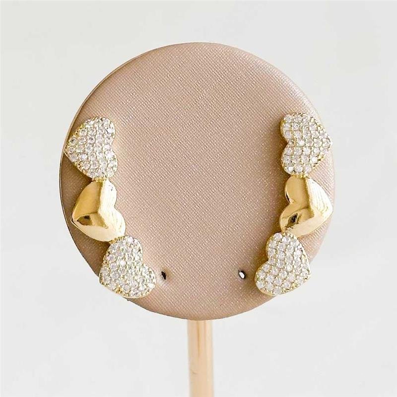 O Brinco Folheado Corações Cravejados e Liso apresenta um design delicado com 2 corações cravejados e 1 coração liso, criando um contraste sofisticado. As zircônias proporcionam brilho intenso, enquanto o coração liso equilibra com elegância. Folheado a ouro 18k, garante acabamento refinado e excelente durabilidade. Uma peça romântica e moderna, perfeita para destacar qualquer produção.Dimensões aproximada: