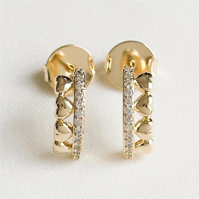 O Brinco Folheado Linha Cravejada Corações une delicadeza e modernidade em um design romântico e sofisticado. Com corações cravejados e folheação em ouro 18k, oferece brilho elegante e acabamento impecável. Ideal para valorizar produções e para quem deseja empreender com semijoias finas e tendências atuais.Dimensões aproximadas: