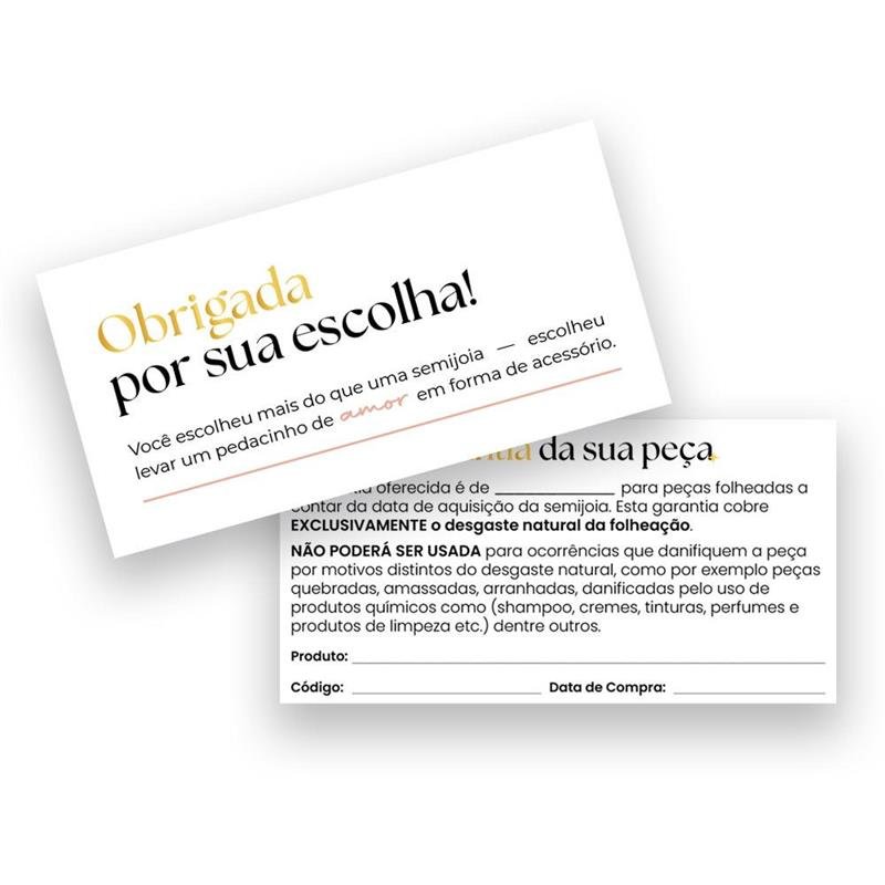 A garantia oferecida é de para peças folheadas a contar da data de aquisição da semijoia. Esta garantia cobre EXCLUSIVAMENTE o desgaste natural da folheação. NÃO PODERÁ SER USADA para ocorrências que danifiquem a peça por motivos distintos do desgaste natural, como por exemplo peças quebradas, amassadas, arranhadas, danificadas pelo uso de produtos químicos como (shampoo, cremes, tinturas, perfumes e produtos de limpeza etc.) dentre outros.Dimensões aproximadas: