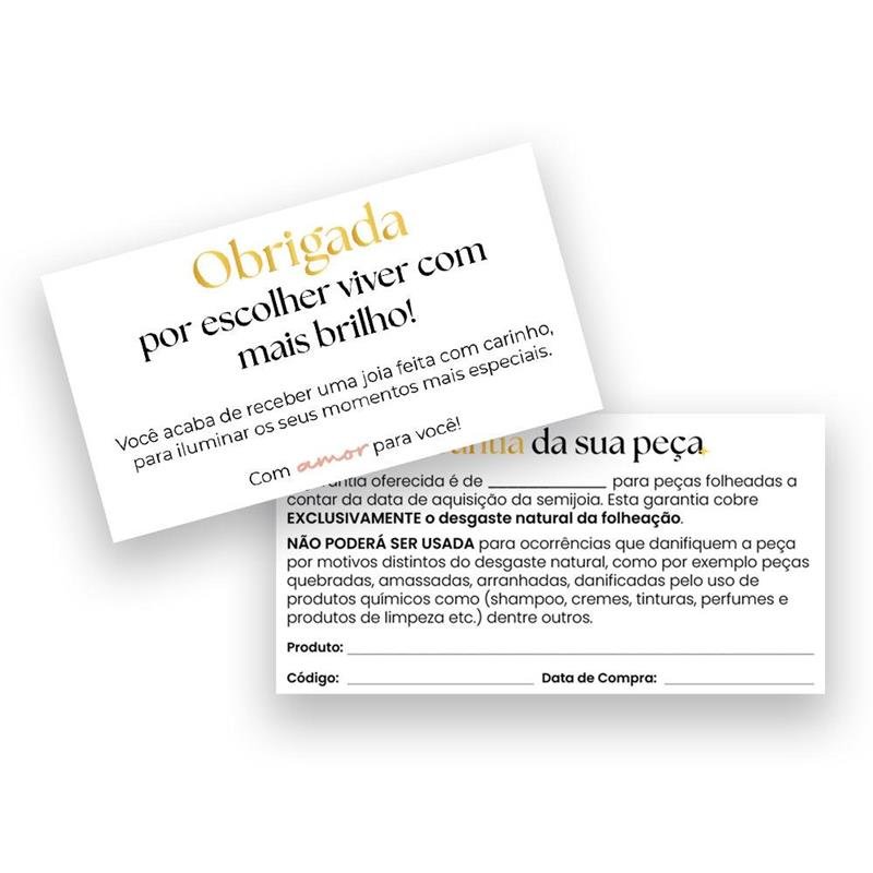 A garantia oferecida é de para peças folheadas a contar da data de aquisição da semijoia. Esta garantia cobre EXCLUSIVAMENTE o desgaste natural da folheação. NÃO PODERÁ SER USADA para ocorrências que danifiquem a peça por motivos distintos do desgaste natural, como por exemplo peças quebradas, amassadas, arranhadas, danificadas pelo uso de produtos químicos como (shampoo, cremes, tinturas, perfumes e produtos de limpeza etc.) dentre outros.Dimensões aproximadas: