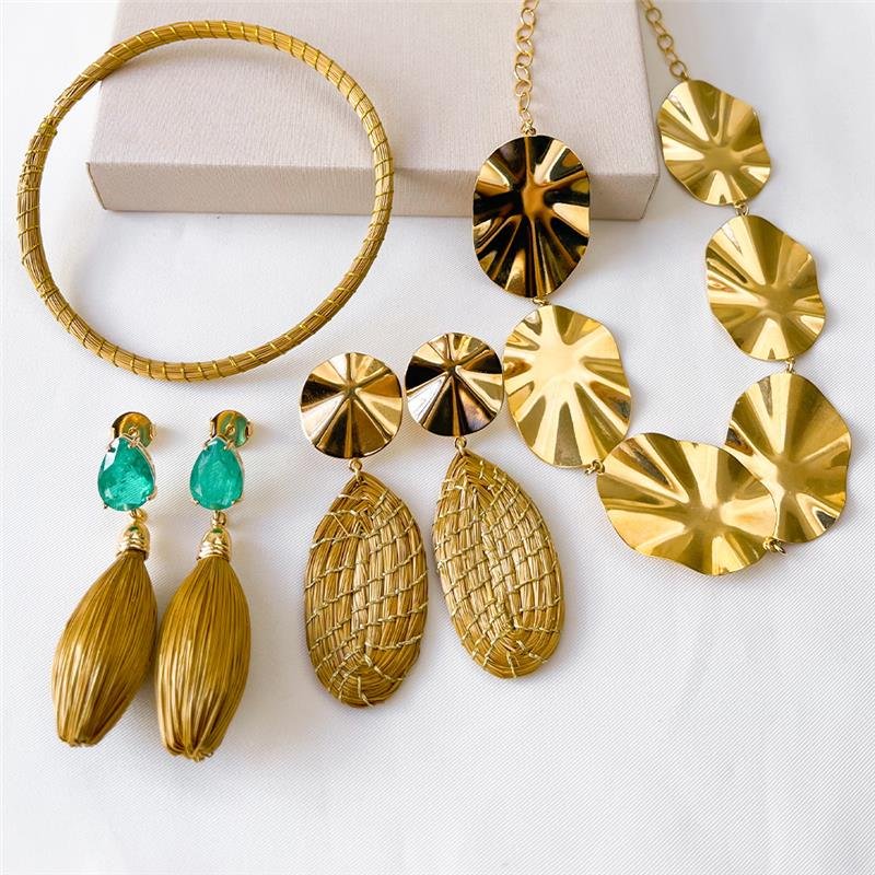 O LOOK BOHO é a escolha perfeita para quem busca sofisticação e autenticidade. Com dois brincos de capim dourado, uma delicada gargantilha lisa e um bracelete de capim dourado, este conjunto traz a leveza e o brilho das semijoias folheadas a ouro 18K. Ideal para revenda e para quem deseja empreender com semijoias finas e tendências exclusivas direto da fábrica.Dimensões aproximadas