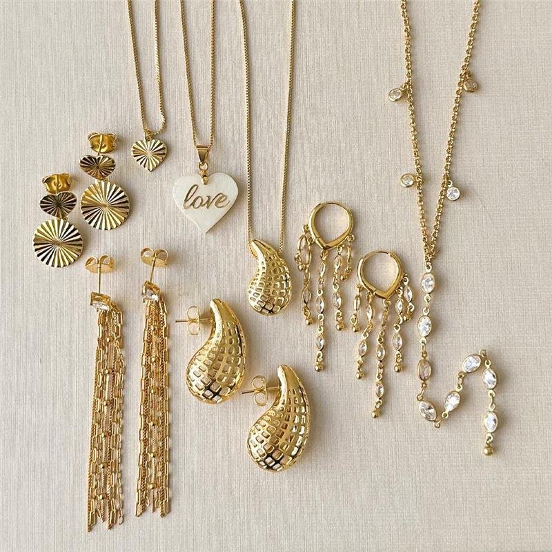 Um conjunto encantador com gargantilhas e brincos que mesclam formas clássicas como gota e coração com detalhes vazados, texturas sofisticadas e pontos de luz. Destaque para a gargantilha coração e o brinco franja, que trazem movimento e brilho com folheação em ouro 18k. Uma seleção perfeita para quem busca elegância e significado em cada detalhe.Dimensões aproximadas: