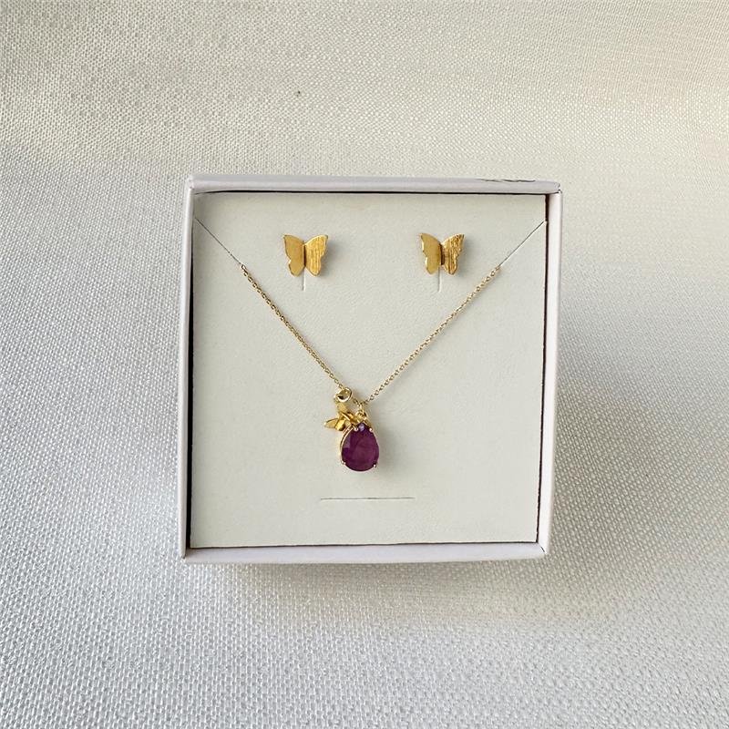 Encante-se com o charme do Conjunto Folheado Borboleta com pedra roxa, composto por gargantilha e brinco. O brilho delicado da pedra aliado ao design gracioso da borboleta cria uma peça romântica e cheia de estilo.Dimensões aproximadas: