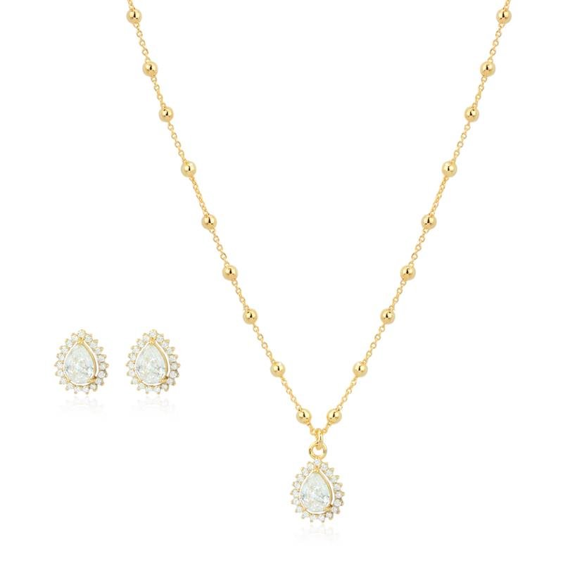O Conjunto Folheado Gota Cravejada Delicada é a escolha perfeita para quem busca elegância e sofisticação. Com 45 cm de comprimento, este conjunto combina a delicadeza de pedras cravejadas com o brilho dourado do folheado 18k. Ideal para destacar sua beleza em ocasiões especiais, traz charme e requinte para o visual.Dimensões aproximadas:
