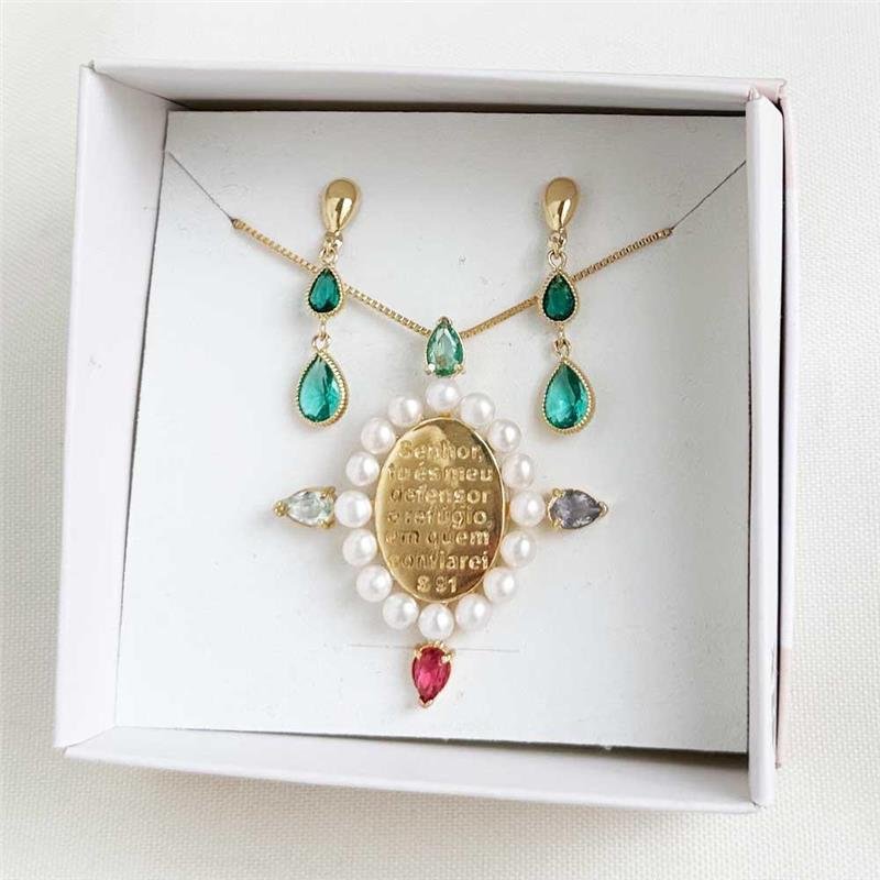 O Conjunto Folheado Pérola Oração reúne delicadeza e fé em uma harmonia perfeita. A gargantilha exala elegância com suas pérolas clássicas, enquanto o brinco complementa com charme sutil e símbolo de proteção.Dimensões aproximadas: