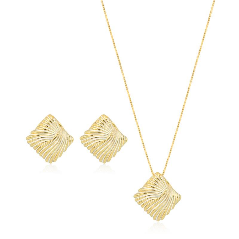 O Conjunto Folheado Quadrado com Detalhes - 45 cm é composto por uma elegante gargantilha com pingente geométrico e um brinco delicado que acompanha o design. A peça é folheada a ouro 18k, garantindo brilho intenso e acabamento impecável.Dimensões aproximadas: