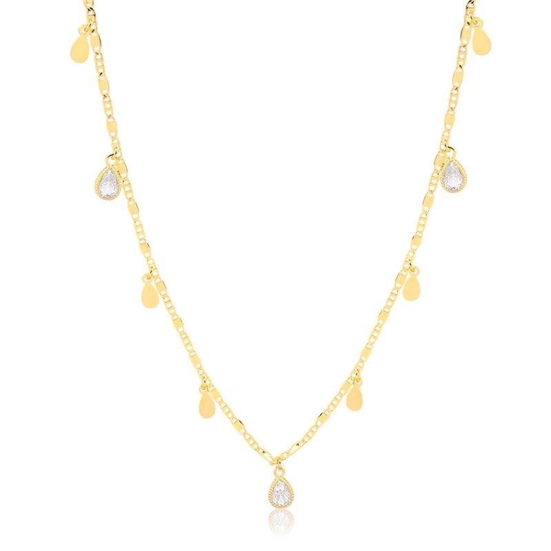 A Gargantilha Choker Folheada Pontos de Luz Gota une modernidade e delicadeza em um design sofisticado. Os pontos de luz em formato de gota iluminam o colo com brilho elegante e feminino. Perfeita para composições atuais, do look casual ao mais refinado. Ideal para quem busca semijoias finas e alinhadas às tendências.Dimensões aproximadas: