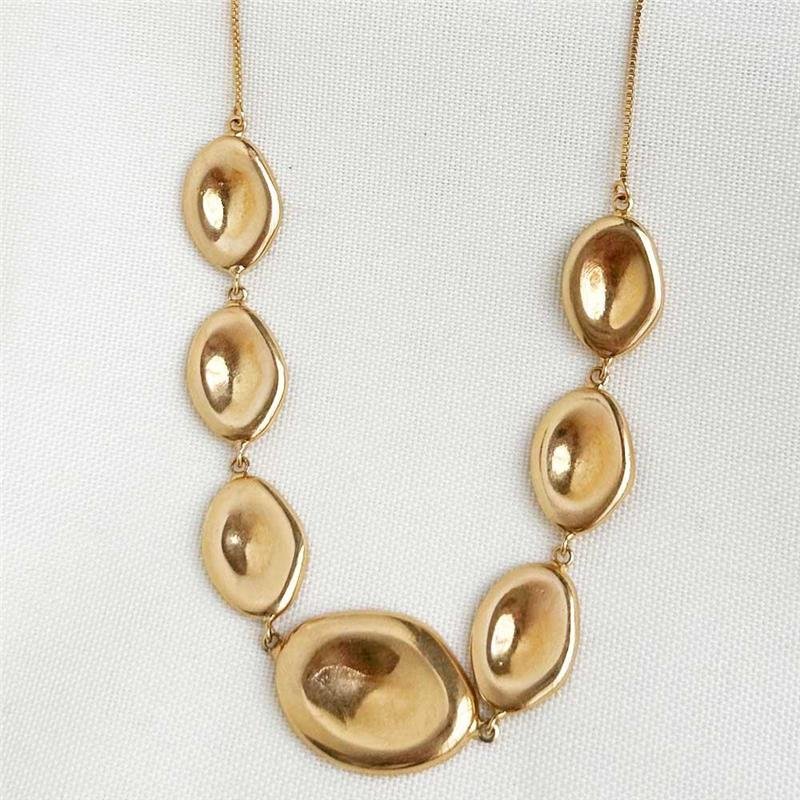 A gargantilha folheada com formas orgânicas é uma peça sofisticada que combina elegância e naturalidade. Seus contornos fluidos e inspirados na natureza capturam a beleza dos elementos orgânicos, como folhas e flores estilizadas. Feita com materiais de alta qualidade e acabamento impecável, essa gargantilha adiciona um toque de delicadeza e modernidade a qualquer visual.Dimensões aproximadas: