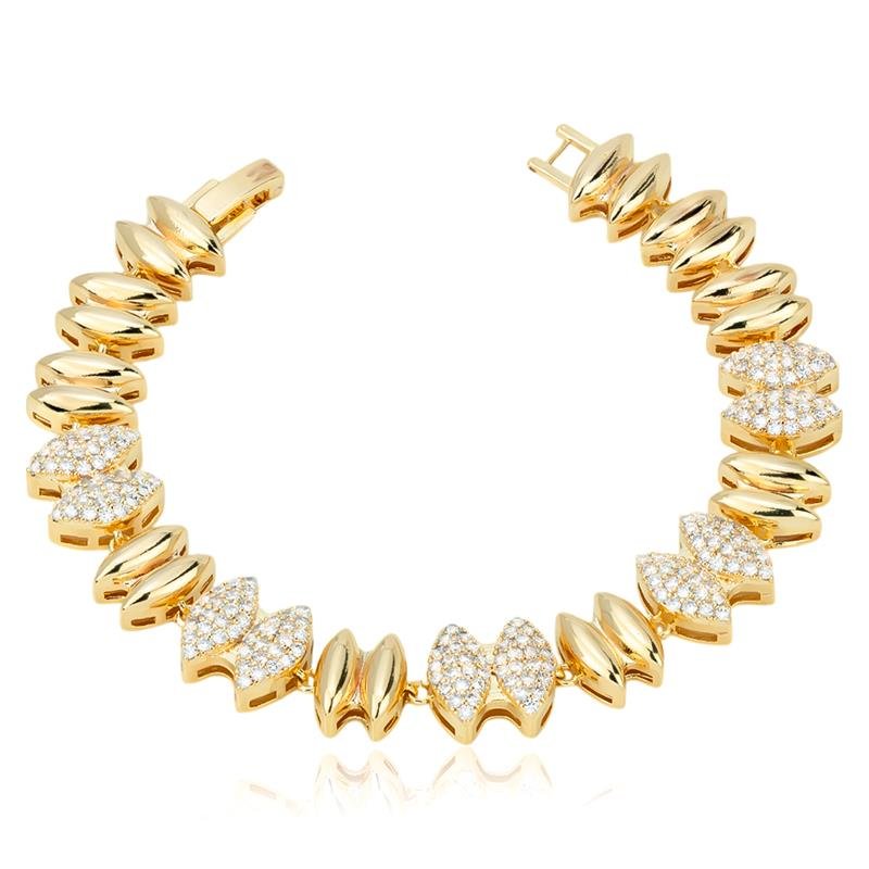 Encante-se com a pulseira folheada com detalhes cravejados, que une sofisticação e brilho em cada peça. Ideal para quem deseja elevar o visual com semijoias finas e atemporais, perfeitas para todas as ocasiões. Aposte na delicadeza e no glamour do ouro 18k e brilhe!Dimensões aproximadas: