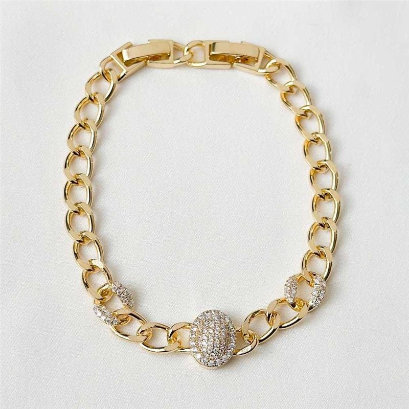 A Pulseira Folheada Malha Grumet Cravejada entrega sofisticação e presença com brilho intenso das zircônias. Seu design clássico valoriza produções modernas e elegantes. Ideal para empreender com semijoias finas, seguindo semijoias tendências do mercado. Perfeita para semijoias no atacado, atacado direto da fábrica, com banho ouro 18k.Dimensões aproximadas: