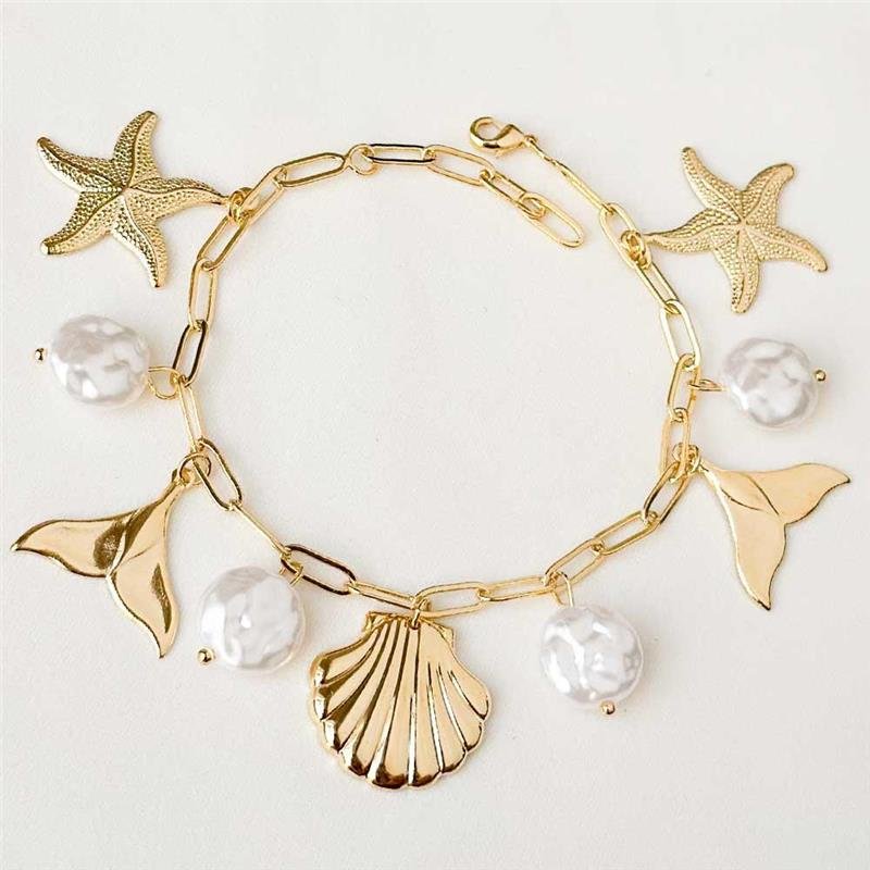Delicada pulseira folheada a ouro, inspirada no mar, com pingentes encantadores que remetem a conchas, estrelas do mar e pérolas. Uma peça sofisticada que une elegância e natureza, perfeita para adicionar um toque de brilho e charme a qualquer look. Ideal para quem busca estilo e delicadeza em um único acessório.Dimensões aproximadas: