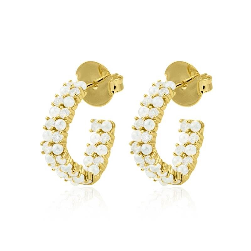 A Semi-Argola Folheada Cravejada Pérolas Shell traz a combinação perfeita entre modernidade e elegância atemporal. Com pérolas shell delicadas e zircônias cravejadas, recebe banho em ouro 18k, garantindo brilho intenso e acabamento refinado. Uma semijoia sofisticada e versátil, ideal para compor looks clássicos ou contemporâneos com charme.Dimensões aproximadas: